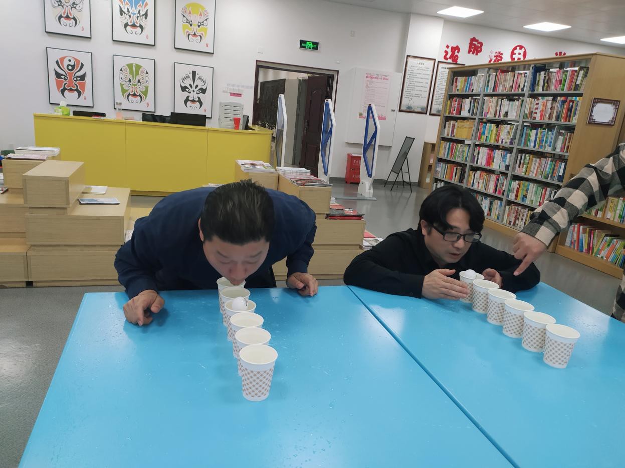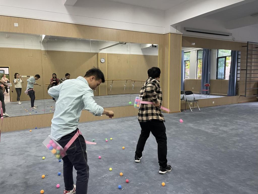 趣味游园会活动主要有巧接彩珠、公鸡下蛋、乒乓球快跑、筷子夹球、你来比划我来猜、纸杯传递等6个游园项目。活动现场轻松活跃,热闹非凡。公鸡下蛋、乒乓球快跑等充满童年记忆的个人游园项目让参与其中的每位老师在重温儿时游戏中不禁笑脸盈盈。纸杯传递、巧接彩珠等趣味与协作并存的团体项目更是让老师们体验到相互之间齐心协力、默契配合的幸福与欣喜。