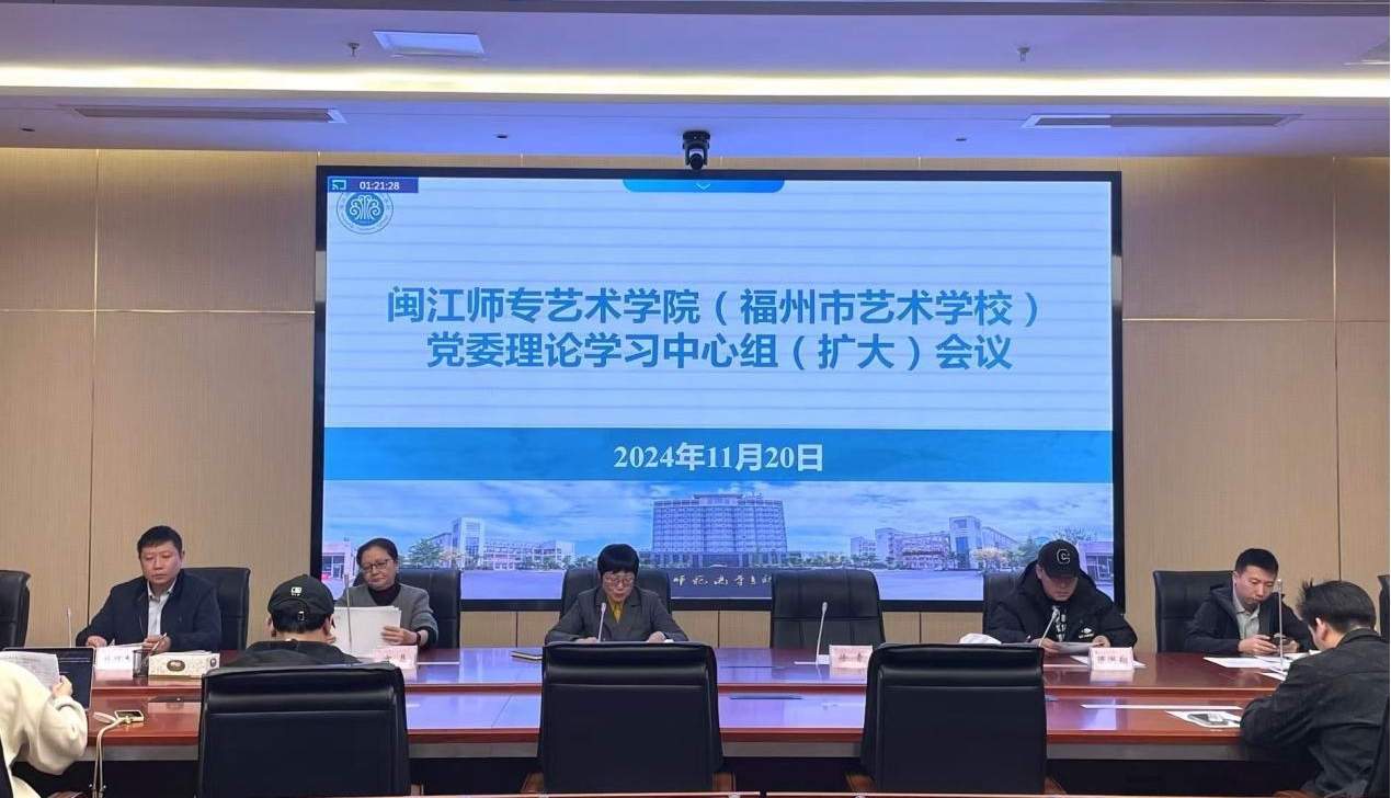 2024年11月20日,艺术学院党委理论学习中心组在图书馆一楼会议室召开(扩大)学习会,传达学习习近平总书记近期重要讲话、回信精神。会议由副校长、艺术学院党委书记江柳青主持,艺术学院党委委员、党政联席会成员及学院中层干部参加。