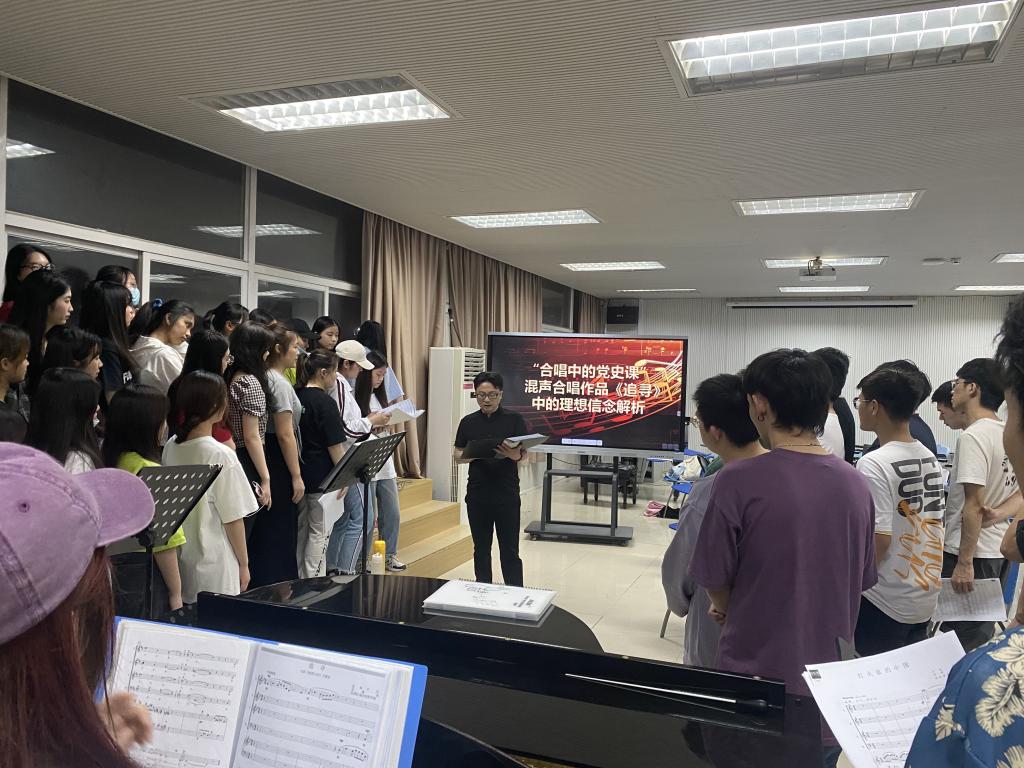 5月19日,在繁星合唱团的日常排练中,指挥徐青老师开展了“合唱中的党史课——混声合唱作品《追寻》中的理想信念解析”主题党史宣讲会。