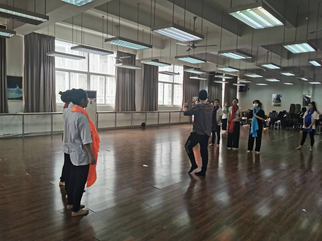 在排练中,为了让学生能更好的理解与完成节目,排练老师积极配合导演,不断的向学生讲解节目所要表现的情感、寓意,启发学生对每一个场景的刻画、角色的塑造与动作的理解。排练中,老师亲自示范,师生们一起在排练场上挥洒汗水。学生被排练老师的精神所鼓舞,排练场上,气氛高昂。