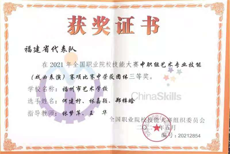 经过为期两个多月的专项训练,我校何建柠、林嘉颖和郑梓晗3名选手通过两轮剧目和唱、念、做、打环节比赛,取得了国赛团体三等奖。作为地方剧种,在与京昆剧种合并比赛、竞争激烈、奖项少的情况下获此殊荣,实属不易。本次比赛得到了学校领导与系部高度重视,艺术系党总支江柳青书记、艺术系副主任(主持工作)、福州市艺术学校校长徐青为此多次召开赛项筹备会议,进行赛项部署,竭力为参赛选手创造最优质的备赛条件。师生与时间赛跑,为学校争得荣誉,全面展示学校教学成果。