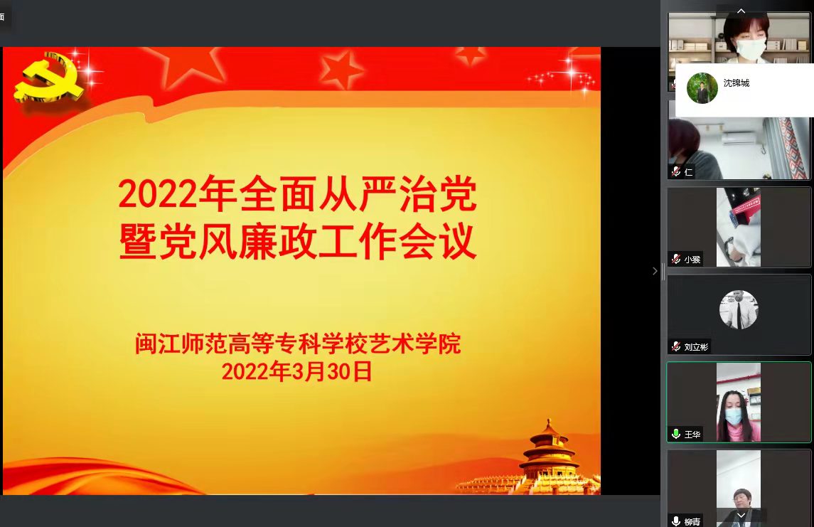 3月30日下午,艺术学院召开2022年全面从严治党暨党风廉政建设工作线上会议,传达贯彻全省教育系统全面从严治党工作视频会议和我校2022年全面从严治党会议精神,回顾总结2021年学院全面从严治党工作和党风廉政建设工作,部署2022年工作任务。会议由艺术学院党委副书记林萍主持,艺术学院党政联席会议成员、各部门及教研室负责人、全体党员、全体思政教育工作者参加会议。