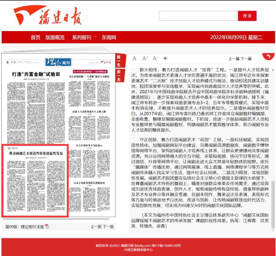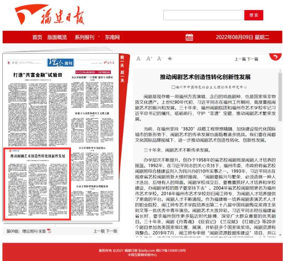 8月9日,《福建日报》发表了由我院党委书记江柳青与院长徐青、副院长林理杰、甘蔗校区办职员洪秀英共同执笔的文章《推动闽剧艺术创造性转化创新性发展》,该文系福州市中国特色社会主义理论体系研究中心“闽都文化国际品牌视域下闽剧艺术的传承发展”课题阶段性成果。