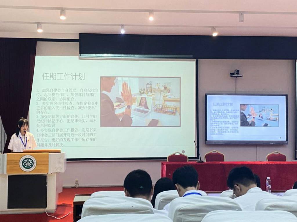首先,第三届学生会执行主席曹晓燕同学作2021-2022学年工作汇报并宣读新一届主席团候选人名单。随后,主席团候选人万子怡和自律会候选人杜艳芳分别根据各部门特点与职责,从制度管理、素质提升、内部建设等方面阐述了本学期的工作计划。