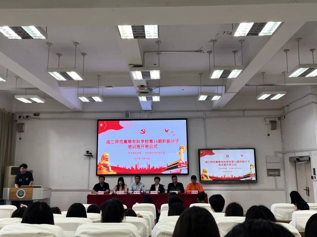 为学习贯彻党的二十大精神,加强对入党积极分子的教育培训,从源头上确保党员发展质量,2022年10月19日下午,艺术学院党委与外语商贸学院党总支在旗山校区2016教室联合举办了“闽江师范高等专科学校第54期入党积极分子培训班”开班仪式。艺术学院党委书记江柳青,外语商贸学院党总支书记林冉,艺术学院党委副书记林萍,党委委员陈洪翔、林理杰、苗雨昕,外语商贸学院学生支部书记钱小莉、综合科科长刘诗雨,以及来自艺术学院和外语商贸学院的87名入党积极分子参加了本次开班仪式。仪式由艺术学院党委委员、团委书记、学生支部书记周宇航主持。