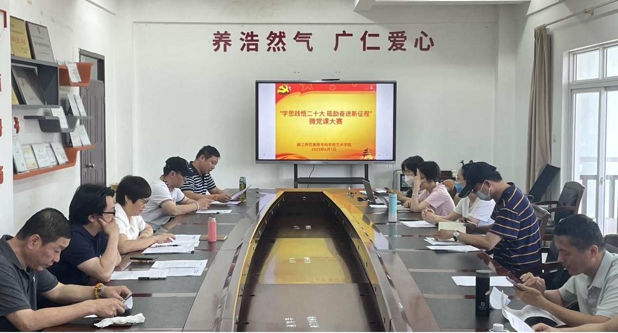 为推动习近平新时代中国特色社会主义思想入脑入心,营造学习贯彻党的二十大精神的浓厚氛围,6月1日上午,艺术学院于甘蔗校区4楼会议室开展以“学思践悟二十大砥励奋进新征程”为主题的微党课比赛,比赛由党委组织委员林理杰主持,党政联席会成员、部分党员代表参加。