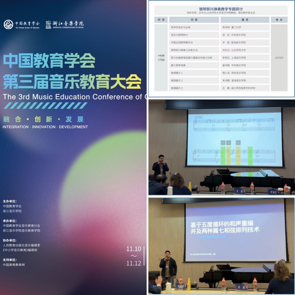 2023年11月10至12日,中国教育学会第三届音乐教育大会在浙江音乐学院举办。在11日举行的“钢琴即兴弹奏教学专题研讨”上,艺术学院钢琴与器乐教研室主任王葳受邀作《基于五度循环的和声重编并及两种属七和弦排列技术》微课展示,获得与会专家一致好评,现场反响热烈。
