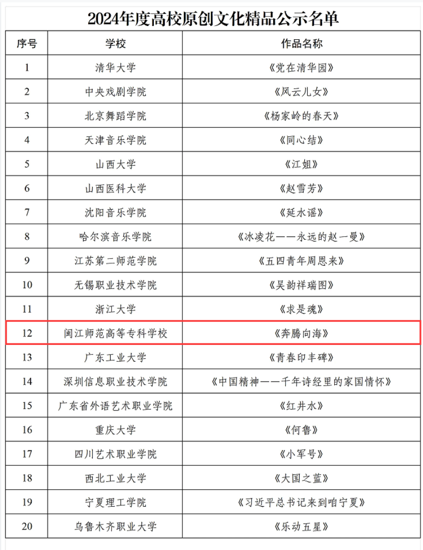近日,教育部官方网站公示了“2024年度高校思想政治工作质量提升综合改革与精品建设项目遴选结果”,我院情景歌舞剧《奔腾向海》入选高校原创文化精品项目,为福建省高校唯一入选。