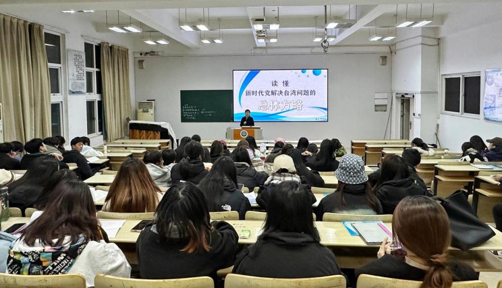 江柳青书记首先以“台湾问题”为切入点,引导学生思考为何台湾是中国不可分割的一部分,祖国必须统一也必然统一。接着,她深入浅出阐释了新时代党解决台湾问题总体方略的理论来源、生动内涵和实践要求,引导学生深入理解新时代党解决台湾问题的总体方略是习近平新时代中国特色社会主义思想的重要组成部分,是党中央治国理政思想在对台工作领域的集中体现,是中国共产党人解决台湾问题、实现祖国统一的最新理论成果。最后江书记号召全体同学要增强对祖国的热爱,厚植家国情怀,学好专业技能,发挥专业特长,努力做推动两岸关系和平发展、推进祖国和平统一进程的坚定支持者、参与者、奋斗者。