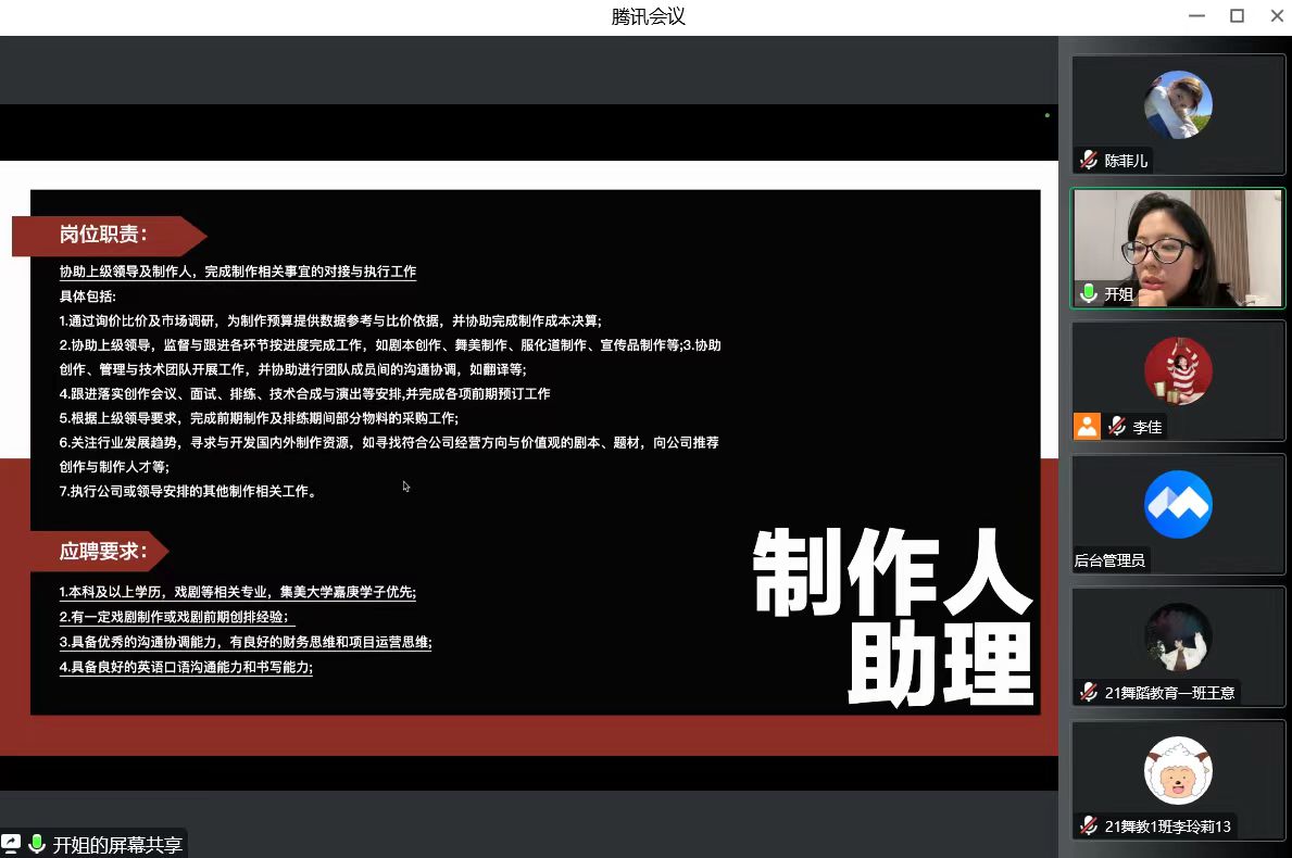 本次线上招聘会以“岁寒情暖,职引未来”为主题,采用企业线上宣讲+在线投递简历+视频面试的方式,旨在进一步深化校企合作,促进毕业生高质量就业。舞蹈教研室主任李佳率全体教研室老师参与并进行线上指导,舞教专业毕业生全员参与。
