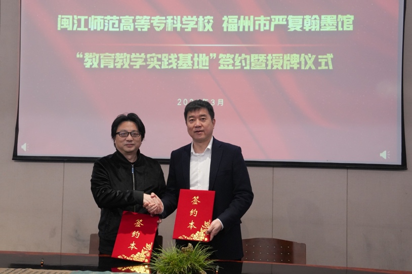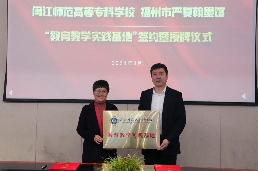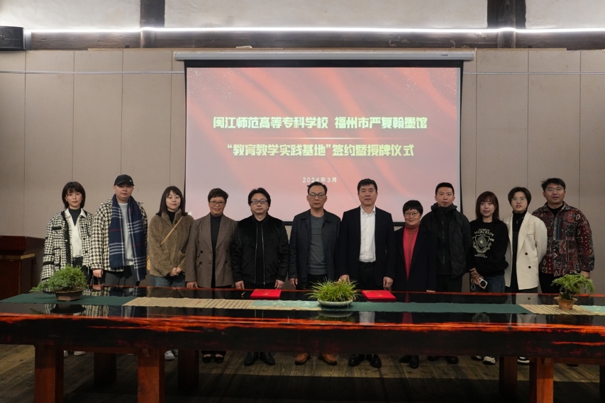 2024年3月14日上午,闽江师范高等专科学校艺术学院与福州市严复翰墨馆正式共建校馆合作“教育教学实践基地”,并在严复翰墨馆举办了隆重而简约的签约暨授牌仪式。副校长陈强携艺术学院党委书记江柳青、院长徐青、副院长陈志勇以及各教研室教师与学生代表出席仪式。双方代表齐聚一堂,共同见证这一重要时刻。