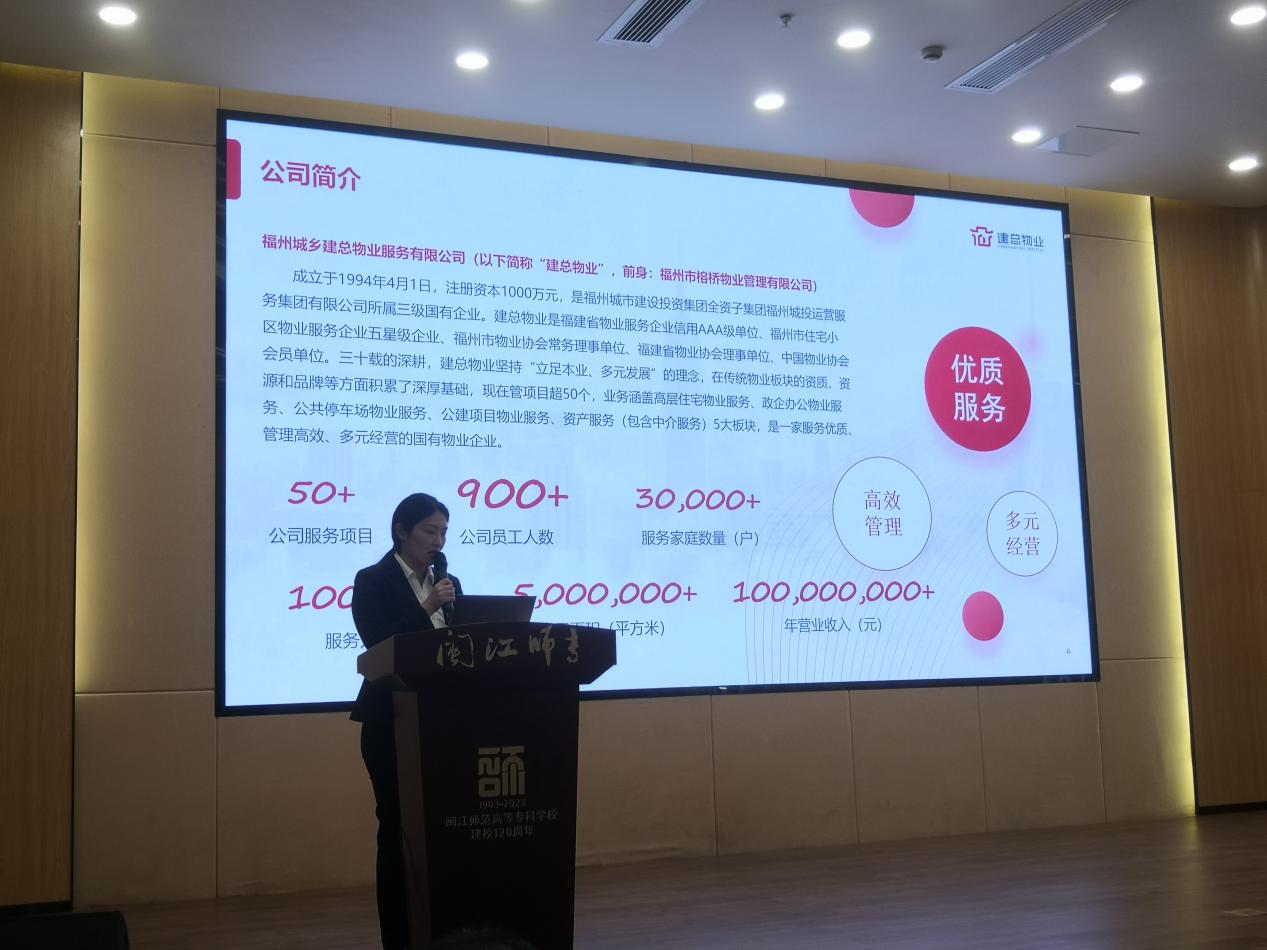 随后,福州城乡建总物业服务有限公司、福州城投光大百龄帮颐养中心、福州闽江之心有限责任公司分别宣讲了企业情况和招聘岗位需求。本次专场招聘会,三家企业为我校毕业生提供了14个岗位,需求人数共41人。