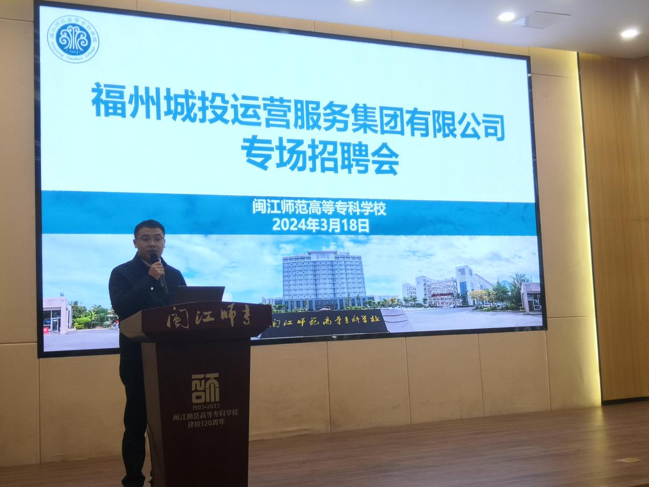 为深化校企合作,助力毕业生高质量充分就业,2024年3月18日下午,闽江师范高等专科学校艺术学院与福州城投运营服务有限公司于旗山校区召开专场招聘会。副校长刘翔炜莅临现场交流指导。福州城投运营服务集团有限公司党支部副书记林为民、福州城投运营服务集团有限公司总经理助理金喆、艺术学院院长徐青、外语商贸学院党委书记林冉、人文与管理学院院长陈勤、学前教育学院党委副书记王海波、艺术学院副院长陈洪翔、学前教育学院党委副书记杨美玲等出席此次宣讲会。毕业班辅导员与2024届毕业生共同参与了招聘会。