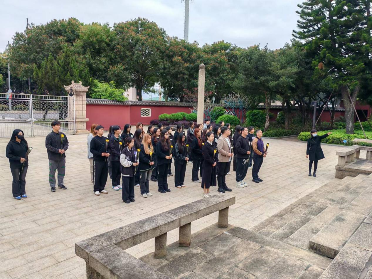 在庄严肃穆的马江海战烈士陵园墓碑亭前,艺术学院全体师生着装整齐,庄严肃立,向英烈默哀致敬,敬献鲜花,表达对先烈的无限追思和崇高敬意。