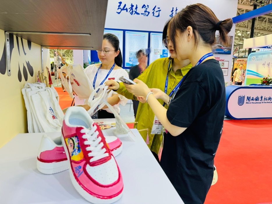 其中,艺术学院美术教育专业展出的作品,有围绕闽剧《双蝶扇》、《兰花赋》为灵感创作的可穿戴衍纸作品,以及通过校企合作引领“双创”理念落地的文创手绘鞋产品。除此之外,还以第十六届中国戏剧节优秀剧目奖《红裙记》为蓝本,提取剧目中男女主妆造特征与剧情核心,设计了系列精美的伴手礼,吸引了众多观众的关注和热议。这些作品充分展示了美术教育专业学生的艺术才华和创作能力,体现“产学研创用”育人模式,将人培定位对标岗位需求,将教学成果转化为实际产品,培育文化产业新生力量。