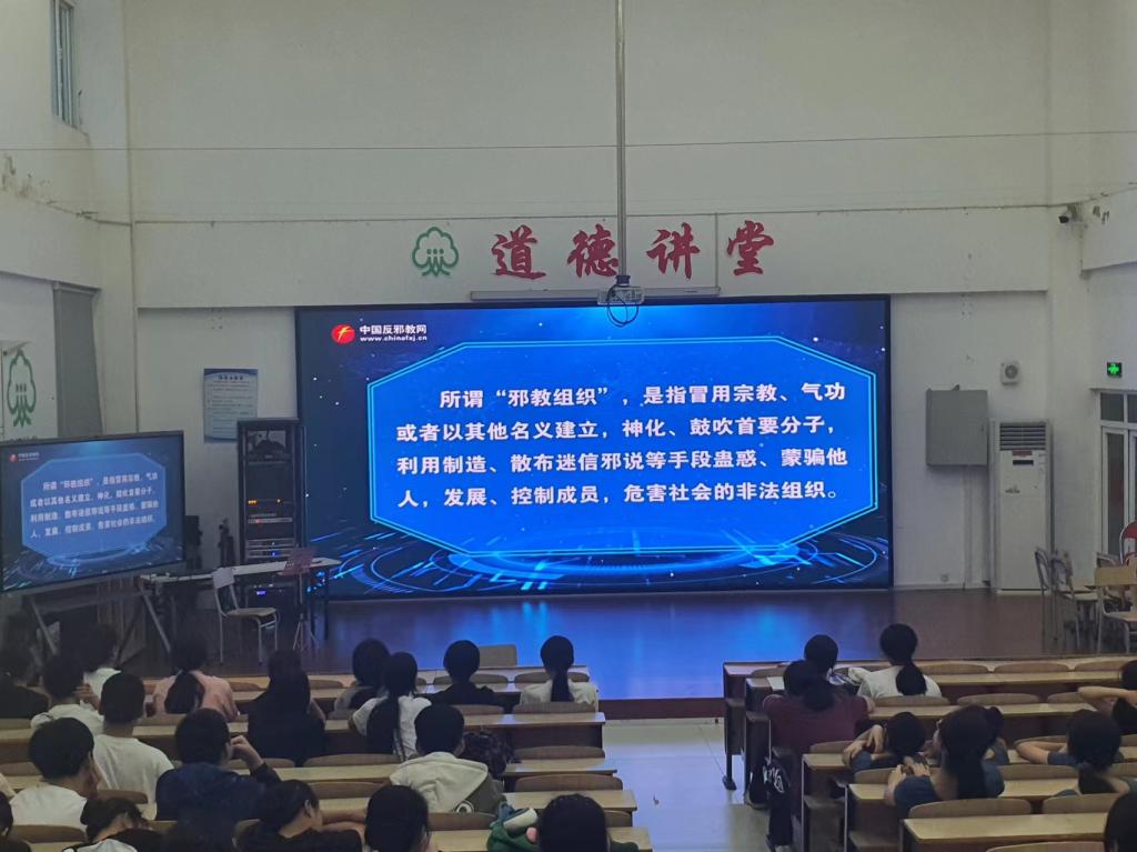 为了进一步推动反邪教警示教育工作的深入开展,切实加强学校学生防邪、拒邪、反邪的意识和能力,创造安全稳定的校园环境,2024年4月29日,我校组织学生在阶梯教室集中观看“反对邪教”警示教育片。