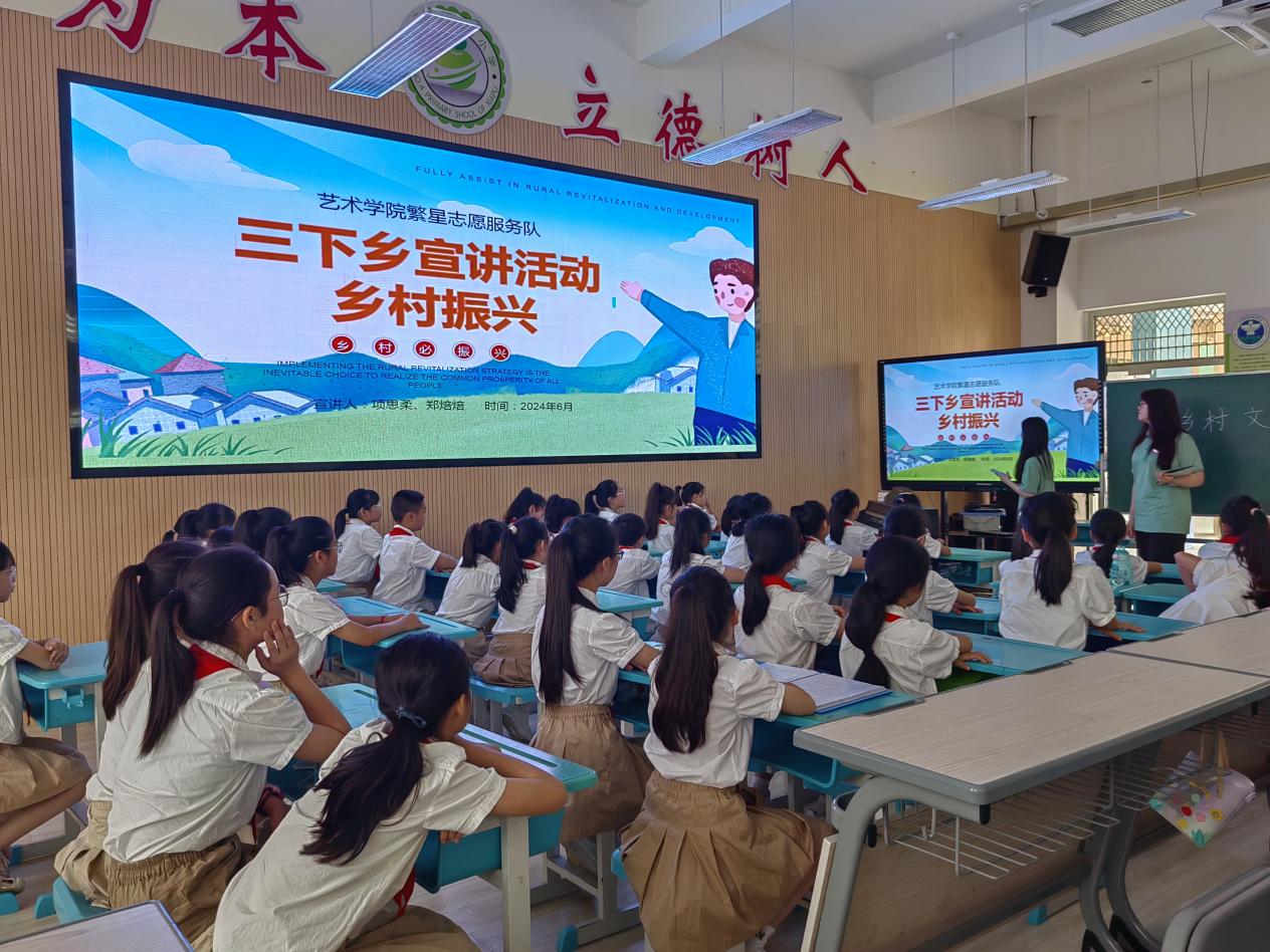 结合大学生暑期三下乡社会实践,我校与霞浦县共同开展暑期艺术夏令营美育活动。举办大学生与小学生三下乡“手拉手”共建帮扶行动,在霞浦县第四小学开展乡村文化振兴主题教育展示微党课活动和资助乡村行主题活动。由我校艺术学院青年主题教育宣讲团负责实施开展。宣讲团同学向小朋友展示了近年来我国乡村文化振兴取得的系列成果并号召同学们要努力学习争做新时代有为一代!