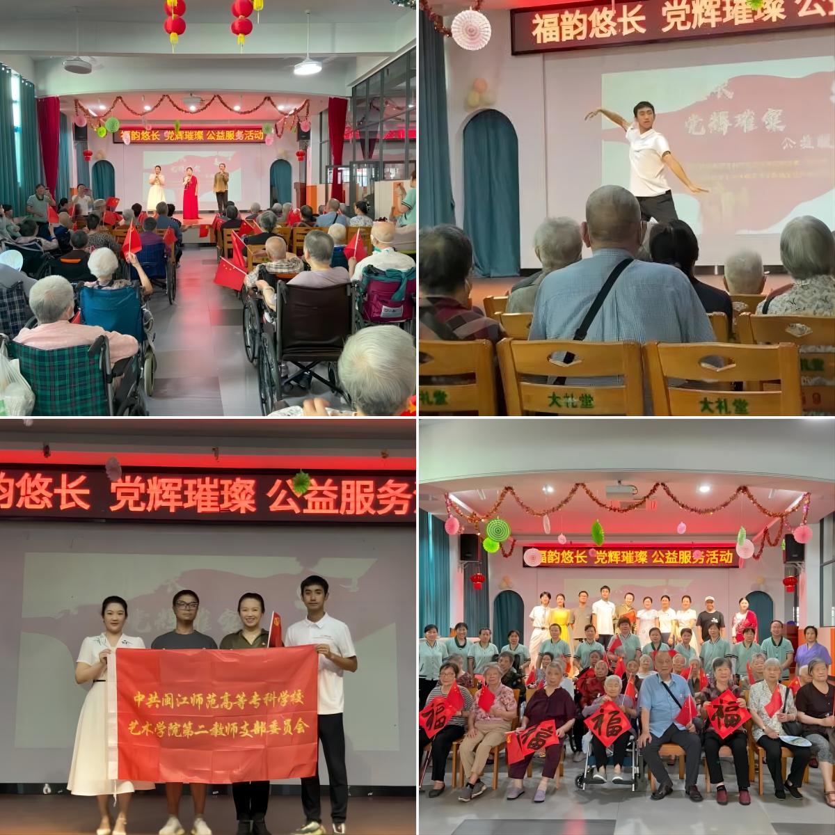 七月流火,党恩如歌。7月5日,闽江师范高等专科学校艺术学院教师第二党支部与艺术学院福文化传承志愿服务队携手走进福建长青养老温馨家园,共同举办了一场别开生面的“福韵悠长,党辉璀璨”志愿服务活动。此次活动旨在通过多元化的艺术形式,传承红色基因,弘扬党的光辉历程,同时融入福文化元素,为福建长青养老的长者们传递幸福与美好的祝愿。