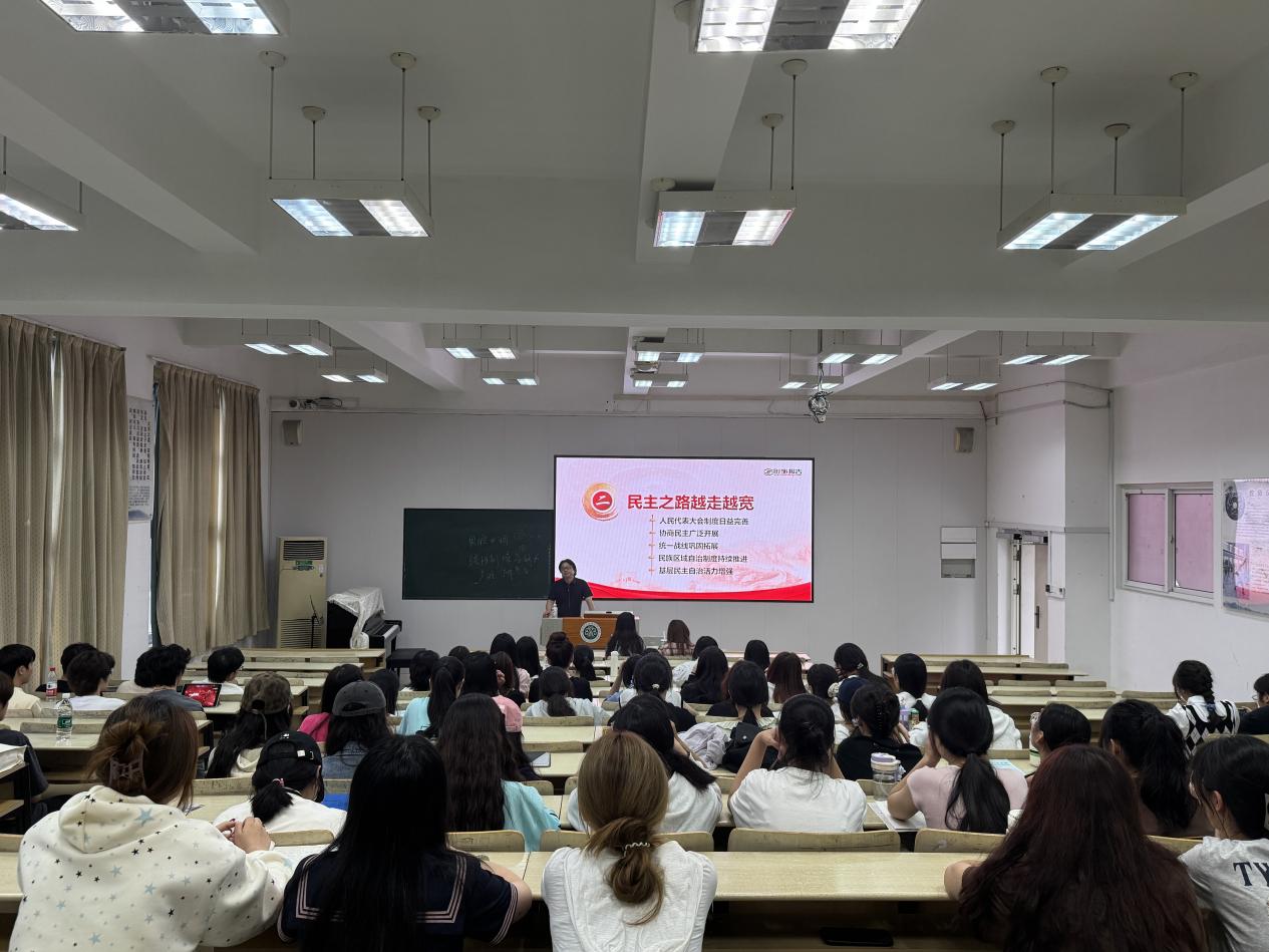 徐院长指出今年是中华人民共和国成立75周年,在一代又一代华夏儿女攻坚克难、接续奋斗下,中国的国家面貌和人民生活发生了翻天覆地的变化。院长带领同学们从经济持续健康发展、民主之路越走越宽、文化发展更加繁荣、人民生活极大改善、美丽中国焕发新颜五个方面回顾了中国共产党带领中华民族从艰难走向辉煌的历程。通过详实的数据和生动的案例,带领同学们着重回顾了中华人民共和国成立75 年以来经济持续健康发展和人民生活极大改善两大方面,特别是近年来我国在科技创新、经济发展、对外开放、人民生活水平显著提高等方面取得的辉煌成就,激发了同学们的爱国情怀和民族自豪感。
