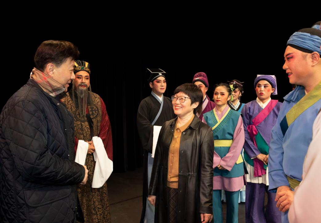 演出结束后,陈力公使夫妇,中国戏曲学院院长、第九届巴黎中国戏曲节评委会中方主席尹晓东,法国文化部戏剧荣誉总监、第九届巴黎中国戏曲节组委会法方主席余尔斯及巴黎中国文化中心主任刘红革等领导、嘉宾专程上台与演员们合影留念。刘红革主任对演出给予了高度评价,他说《红裙记》演出不仅传播了闽剧,得到法国观众的认可,更为第九届巴黎中国戏曲节做出了贡献。他期待我校闽剧艺术交流团组能够再次来访,为法国观众带来更多精彩的戏曲表演。
