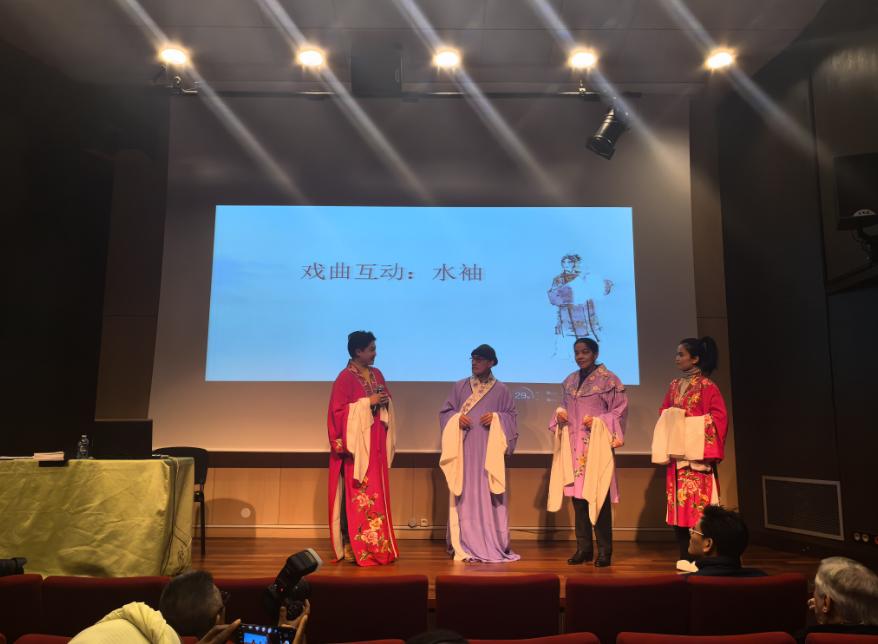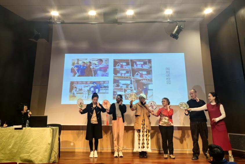 11月7日上午,江柳青副校长在巴黎中国文化中心主讲了一场戏曲艺术学术讲座,以《推动闽剧艺术创造性转化创新性发展》为题,深入浅出地介绍了闽剧的发展历史、艺术特征以及教育传承等方面的内容,为观众呈现了一幅闽剧艺术的绚丽画卷。讲座中,还穿插了闽剧经典剧目《荔枝换绛桃》的选段表演、椰胡现场即兴演奏以及“水袖”“团扇”等动作的现场示范教学,让法国观众在互动中感受到了闽剧艺术的独特魅力和时代价值。