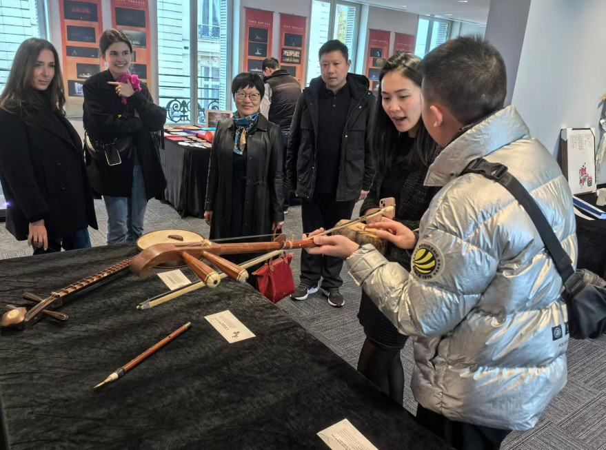 值得一提的是,期间学校还在巴黎欧视巴黎人文交流中心设置了一个特别的展览区,展示椰胡、逗管及双清等闽剧特色乐器,深受法国观众的欢迎。他们对这些传统乐器表现出浓厚的兴趣,不时上前细看乐器的构造,并在学校器乐教师的专业指导下亲自试弹这些乐器,感受中国传统音乐的韵味。这不仅为法国观众提供了一个近距离接触和了解中国传统乐器的机会,还通过沉浸式的参观体验,进一步加深了他们对中国传统音乐文化的认识和喜爱。