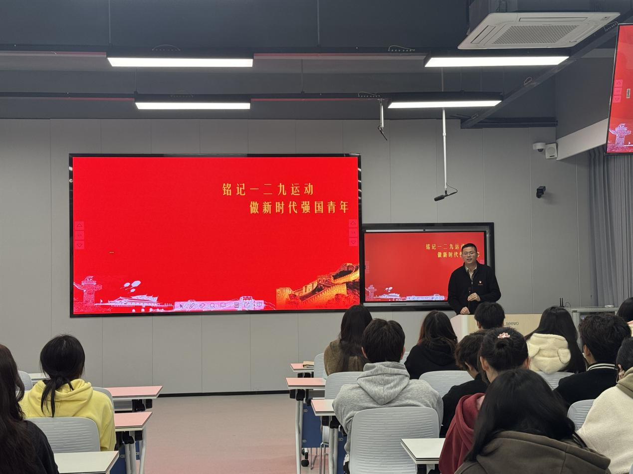 为纪念“一二·九”抗日救亡运动89周年,进一步弘扬爱国主义精神,激发青年学生的爱国情怀和民族使命感,12月9日晚,艺术学院邀请校团委副书记江秀冬开展“铭记一二·九运动,做新时代强国青年”主题微党课暨《青春之歌》观影活动,艺术学院团委书记周宇航,辅导员陈婧老师,学院学生党员、入党积极分子、团员代表等80余人共同参与。