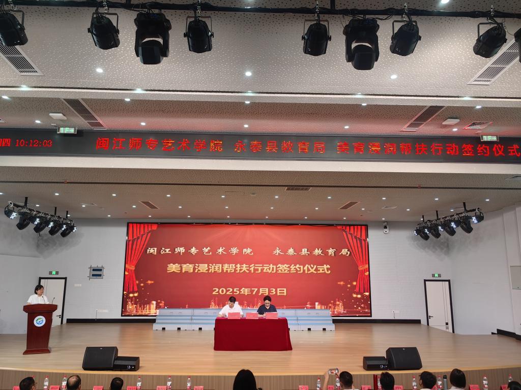 2025年7月3日上午9:30,闽江师范高等专科学校艺术学院与永泰县教育局美育浸润帮扶行动合作协议签约仪式在永泰县实验小学教育集团刘岐分校多功能厅顺利举行。双方代表及永泰县多所中小学相关负责人齐聚一堂,共同开启美育合作新篇章,助力永泰县美育事业高质量发展。