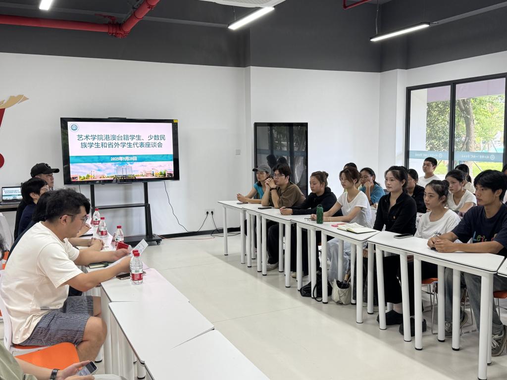 为铸牢中华民族共同体意识,加强各民族学生之间的沟通与交流,9月28日中午,艺术学院在旗山一站式社区召开港澳台学生、少数民族学生及省外学生代表座谈会,校党委委员、副校长、艺术学院党委书记江柳青,院长徐青,副院长方晶、陈洪翔,各教研室主任、辅导员及班主任参加座谈。活动由学院团委书记周宇航主持。